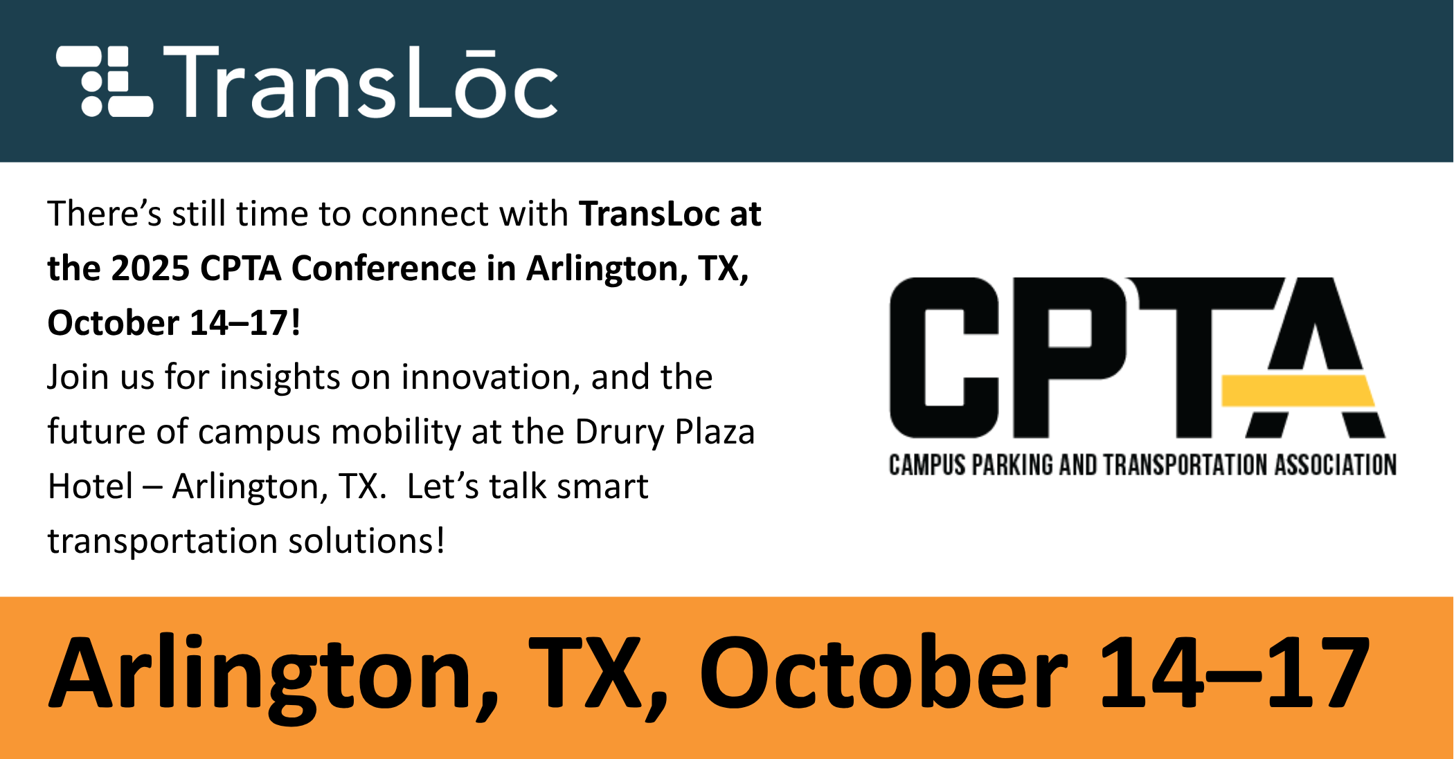 CARY, NC, October 16, 2025 — TransLoc, a leader in intelligent transportation solutions, is proud to announce its participation in the 2025 Campus Parking & Transportation Association (CPTA) Conference, taking place October 14–17 in Arlington, Texas.