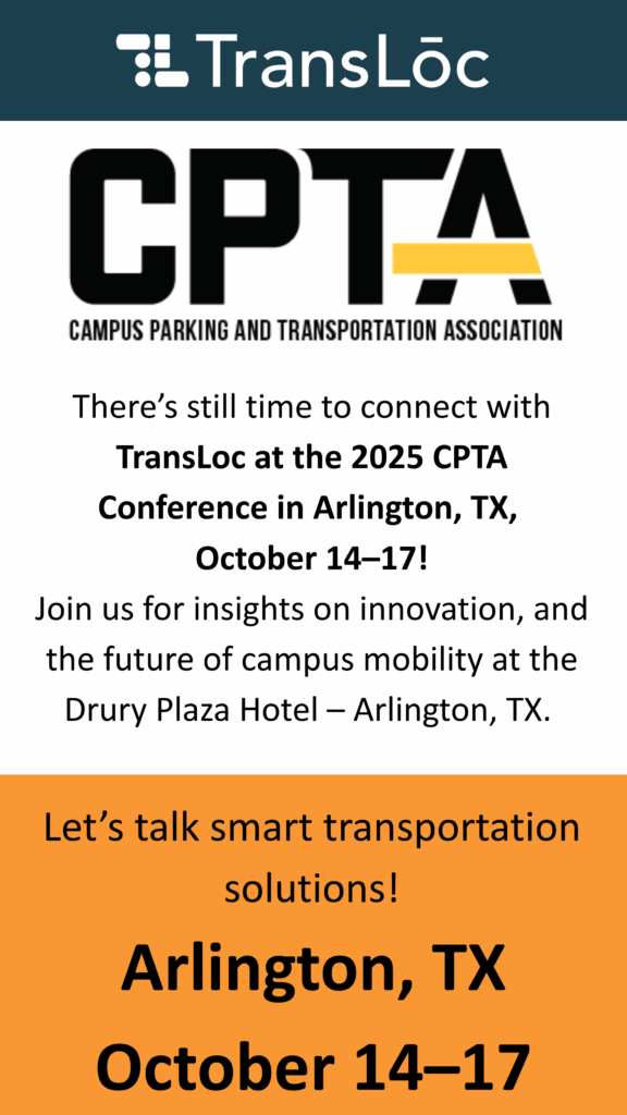 CARY, NC, October 16, 2025 — TransLoc, a leader in intelligent transportation solutions, is proud to announce its participation in the 2025 Campus Parking & Transportation Association (CPTA) Conference, taking place October 14–17 in Arlington, Texas.